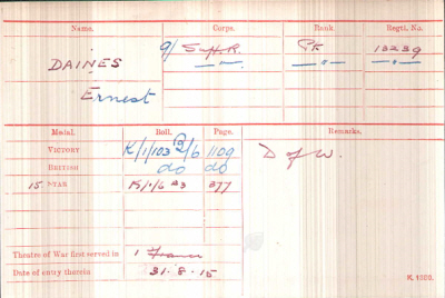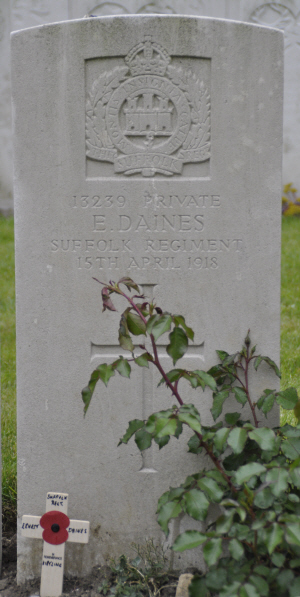 Ernest August Daines was born in Kirtling in 1895 (Newmarket Q3-1895 3B:504 ), baptised in Kirtling on 8th September 1895, son of Joseph Alfred and Rebecca DAINES
