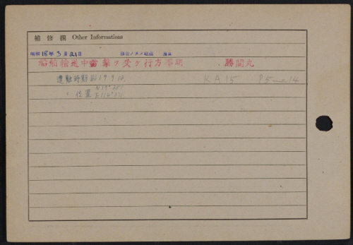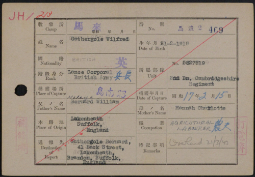 Wilfred was captured by the Japanese in Singapore. It is not known when or why he was mentioned in despatches From the book "God's without reason" Capt. C.F.Blackater 1948 Capt.Blackater was assigned to start a pig and duck farm (at Tamarkan ?), everything had to be constructed from scratch. The Captain states that he was lucky enough to get L/Cpl Gathercole from the Cambridgeshire Regiment to help. He was full of praise for him during his time running the farm. When the Captain was ill with dysentry and ulcers he describes how Gathercole washed him, fetched and carried for him and piggy backed him to and from the latrines. As times got more normal L/Cpl Gathercole became the Captain's batman. With time and better conditions men began to improve physically and the Japs started to send groups of men back to Singapore to be transported to Japan. The Captain says the last time he saw faithful Gathercole was when he was amongst 3,000 men marching out of the camp. On 4th September 1944 a convoy left Singapore, amongst the vessels were two ships with over 1,2000 prisoners of war on board being taken to mainland Japan for forced labour. About 900 were on the 'Kachidoki Maru'[KA-15] and 1,300 on the 'Rakuyo Maru' [KA-25]. On the morning of the 12th September the US submarine 'Sealion' torpedoed the Rakuyo Maru and just before midnight that same day the US submarine 'Pampanito' torpedoed the Kachidoki Maru. At 22:54, LtCdr (later Rear Admiral-Ret) Paul E. Summers’ (USNA '36) USS PAMPANITO (SS-383) fired three torpedoes at KACHIDOKI MARU and got one hit in No. 7 hold that caused flooding. At 23:15, KACHIDOKI MARU stopped and foundered. At 23:37, she sank by the stern. 12 sailors and 476 passengers (including the POWs) were KIA. The escorts rescued 521 POWs and transferred them to KIBITSU MARU for Japan. American submarines later returned and rescued 159 survivors of whom seven died enroute to Saipan. In all, 92 Australian and 60 British ex-POWs survived . These Japanese vessels came to be known as the "Hell Ships" due to the inhuman treatment of the prisoners on board. |