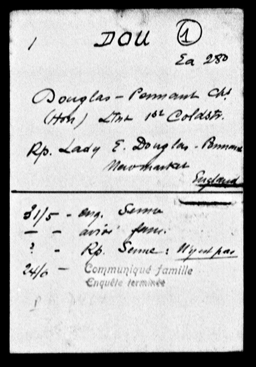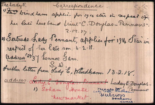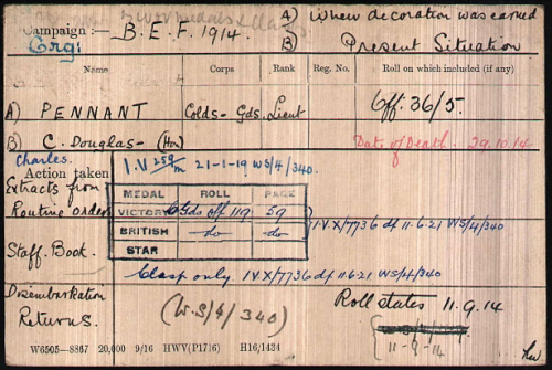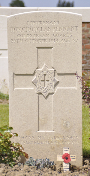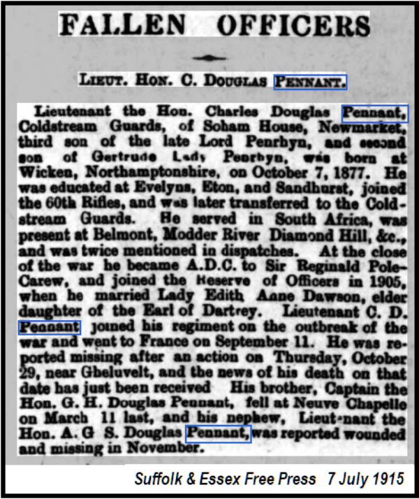 His entry in Du Ruvigny's Roll of Honour reads:- DOUGLAS-PENNANT, HON.CHARLES, Lieut., 1st Battn.Coldstream Guards, 3rd s.of George Sholto Gordon, 2nd Lord Penrhyn and yr.s.by his 2nd wife, Gertrude Jessie (37, Lennox Gardens, S.W.),yst.dau. of the Rev.Henry Glynne, Rector of Hawarden: b.at Wicken, Northants, 7 Oct.1877: educ. Eveleyn's; Eton, and Sandhurst; gazetted 2nd Lieut., Coldstream Guards, 8 Sept.1897, and promoted Lieut. 5 Feb.1899; served in South African War, 1899-1902; took part in the advance on Kimberley, including actions at Belmont, Enslin, Modder River and Magersfontein; operations in the Orange Free State, including actions at Poplar Grove, Driefontein, Vet River (5-6 May) and Zand River; operations in the Transvaal, May-June 1900 including actions near Johannesburg, Pretoria, and Diamond Hill (11-12 June); operations in the Transvaal, east of Pretoria, July to 29 Nov.1900, including actions at Belfast (26-27 Aug), operations in Cape Colony,Nov.1900 to 31 May, 1902 (twice mentioned in despatches [London Gazette, 26 Jan.1900 and 10 Sept.1901); Queen's medal with six clasps, King's medal with two clasps; was A.D.C. to Maj.Gen.8th Division, Irish Command (Sir Reginald Pole-Carew), 9 Nov.1902 to 1905; retired and joined the Reserve of Officers, 22 Feb.1905; rejoined his regt.on the outbreak of war went out France, 11 Sept.1914; was reported missing after the fighting near Gheluvelt, 29th Oct.following, and is now assumed to have been killed in action there that day. He m. at St.Michael's, Chester Square, 28 Jan.1905, Lady Edith Anne, née Dawson (Soham House, Newmarket), dau of Vesey, 2nd Earl of Dartrey. His elder brother, Capt.the Hon.G.H.Douglas-Pennant was killed in action, 11 March,1915, and his nephew, Lieut. the Hon.A.G.S. Douglas-Pennant was reported wounded and missing, 29 Oct.1914. He was appointed Justice of the Peace in 1912. His wife later became Lady Edith Windham of Swaffham Prior, Cambridgeshire He was reported missing near Gheluvelt in Belgium, the Newmarket Journal of 7th November 1914 :- Mr. DOUGLAS-PENNANT WOUNDED News has been received that the Hon. Charles Douglas-Pennant, of Soham House, Newmarket, is wounded and a prisoner. His wound, it is stated, is not serious, but prevented him from keeping up with his regiment, the Coldstream Guards, and caused him to fall into the hands of the Germans. Mr Douglas-Pennant is a son of the late Lord Penrhyn, and married in 1905 Lady Edith Anne Dawson, second daughter of the Earl of Dartrey. During the South African War he was A.D.C. to General Pole-Carew, and he rejoined his regiment whenthe present war broke out." Then, on 3rd July 1915 the Newmarket Journal reported:- THE HON.CHARLES DOUGLAS-PENNANT "After having for several months been kept in suspense Lady Edith Douglas-Pennant of Soham House, Newmarket, has now received news which unfortunately leaves little reason to doubt that her husband, Lieut.,the Hon Charles Douglas-Pennant of the 1st Battalion, Coldstream Guards, met his death on October 29th Last year, near Gheluvelt. Mr. Douglas Pennant, a son of the late Lord Penryhn and brother of the present peer, was only 37 years of age. His wife is a daughter of the Earl of Dartrey. Though he had resided in Newmarket for some years Lieut.Douglas Pennant took no part in public affairs; but the same sense of responsibility which led him to give his services to his country as soon as the war broke out, led him to take a real interest in the welfare of those around him, and by all in Newmarket who knew him, personally or by repute, he was held in high respect. In her loss Lady Edith has the heartfelt sympathy of everyone in the district. From the Llangollen Advertiser February 23rd 1917:- Lieut. the Hon.Charles Douglas-Pennant. Information has been received from the German Red Cross Society that Lieut.the Hon.Charles Douglas-Pennant, Coldstream Guards, who was reported wounded and missing after the action near Ghiluvelt at the first battle of Ypres, Ocotber 29th, 1914, was re-buried by the Germans on November 18th 1916,in the cemetery at Reutel, Belgium. A private letter from a prisoner of war in Germany showed that Lieut.Charles Douglas-Pennant had been killed in action, and he was reported officially in 1915 "unofficially believed killed". The information just received is the first that has come officially from Germany. The German list also gives the name of Lieut. C. Douglas-Pennant's servant F.T.Edwards, and of another officer in the same company, Sec.Liuet. Chas Williams Wynn, only son of Mr.and Mrs. A. W.Williams Wynn of Coedymaen.Wynn. |