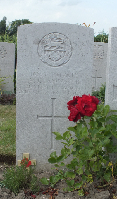 going via Egypt and landing at Cape Helles on 25 April 1915. The 14th Battalion sailed to France, landing at Le Havre on 6th March 1916. It is not possible to be completely sure in the absence of his Army records and the fact that Alfred died of gassing (according to the cemetery register), exactly when and where he was injured. Certainly it appears to have been in the 3rd Battle of Ypres (Passchendael), the following is highly likely; On the night of the 25th of September 1917 the 14th Hampshires moved forward from reserve positions for an attack the following morning. Their objective was the German position known as Tower Hamlets and "Tower Trench" behind them. These positions had failed to fall during an assault on the 20th and it had been decided to attack them again. Major Frank Goldsmith led the 14th Hampshires in the attack, At 5.30am the battalion went over the top and almost immediately Major Goldsmith was fatally wounded. His place was taken by Captain Dawson who led his men in a successful attack which led to the capture and consolidation of Tower Hamlets. On the 27th the battalion was relieved having suffered losses of 4 officers and 75 other ranks killed with 3 officers and 118 men wounded. There were three C.C.S. at Godewaersvelde where Alfred is buried, 16 km west of Ypres, the Hampshires were fighting to the south east of Ypres |