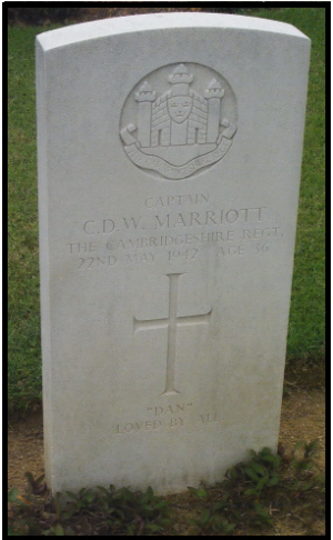 Captain Marriott, usually known as "Dan", was involved in the taking of Water Tower Hill in Singapore on 13th February 1942. "Battalion at War" by Michael Moore, regarding 'Reinforcement' Company, recounts that:- "Capt Marriott led his men into the valley, while "D" Company laid on supporting fire with Brens and mortars, the Japanese swept the southern slopes of the hill with heavy machine gun fire,but despite appalling casualties the 'Reinforcement' Company pressed home its attack. ... Capt Marriott was seen to fall wounded when only half way up the hill, but he picked himself up and waved his men on. Capt. Marriott urged his men forward and personally led a charge towards an enemy machine gun post, which he attacked with grenades. Again he fell, shot through the body by a burst of machine gun fire, but his brave action gave his men encouragement to continue the assault. Lt Orton Taylor (also from Newmarket) immediately took command and led the attack towards the summit. Capt Marriott survived, to be taken prisoner, and was later to die in Roberts Hospital, Changi. Buried in Changi Cemetery, he was moved to Kranji on 21st April 1946. |