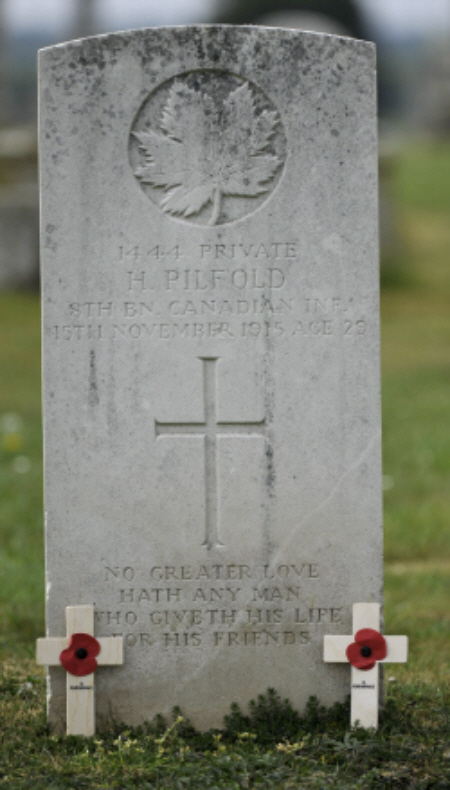 Newmarket records and his grave marker and Canadian Army forms have PILFOLD National Archives of Canada RG150/Accession 1992-93/166,Box 7834-17. Initially in the 8th Battalion, 96th Lake Superior Regt, they sailed for Europe on 3rd October 1914. On 24th April 1915 he was on duty in Ypres, and was next in Hazebrouck. Sustaining a gunshot wound to the head and suffering from gas poisoning he was taken to 4 Field Ambulance, then to 2 Field Bakery Canadian Aid Station, then admitted to 12 General Hospital, Rouen, on 7th May 1915, being transferred to 2 Western General Hospital Manchester on 11th May. Via Worsley Hall he then reached Canadian Convalescence Hospital, Monks Hall. He was granted sick leave on 25th May and discharged as fit for duty on 29th July and posted to 11 Reserve Battalion at St Martins Plains, Shornecliffe. He then requested transfer to 32nd Battalion which seemingly was granted, but he was transferred to Canadian Ordnance Corps in Ashford on 18th September 1915. He had a 3 day leave to Newmarket just before his death, which he apparently overstayed as he was docked 2 days pay on 6th November for being absent without leave. On 15th November he was found dead in bed and the records show death was due to heart failure consequent to his gas poisoning. Records from Ashford say that he died at 105 Christchurch Road, Ashford on 15th November 1915. (Ashford Q4-1915 2A:1173). A coroners inquest held that it was from heart failure as a result of chronic bronchitis and pulmonary congestion consequent to gas poisoning received in action. The Newmarket Journal of 20th November reported:- Newmarket and the War - HERO'S DEATH FROM GAS POISONING One of the first to answer his country's call, upon the outbreak of the war, was Pte. Harry Pilfold, second son of Mr.Jas.Pilfold, of Nelson Cottage, Icewell Hill, Newmarket, who enlisted on Aug.19th 1914, in the 8th Co., 90th Winnipeg rifles, and came to England with the 1st Canadian Contingent, which reached England in the following September. He sailed for France with his battalion on Feb.10th,1915, and before he had been long in the trenches was slightly wounded in the head by a shell splinter, on March 5th. The magnificent courage and tenacity shown by the gallant Canadians in the memorable fighting in the Ypres district will never be forgotten; and Pte. Pilfold was in the thick of the fighting during the whole time when the Canadians gained such undying fame. He was "gassed" three times in April, and after being in hospital at Rouen, was sent over to the Manchester Infirmary. Subsequently he was in a convalescent home, and then, being considered fit for light duty, was attached tot he Canadian Ordnance Corps at Ashford, Kent. He was home on three days leave little more than a week ago, and then returned to his duties. He, however, never recovered from the effects of the German gas, and on Tuesday was found dead in his bed at Ashford. An inquest was held on Wednesday, and was attended by his father and his eldest brother, Mr.John Pilfold, road foreman at Bury St.Edmunds. The medical evidence showed the the "gassing" had caused chronic bronchitis and congestion of the lungs.The right side of the heart was very much enlarged, and the spleen was three times the normal size. A verdict of "death from gas poisoning" was returned, the coroner remarking that it was the equivalent of "death from wounds received in action" - Pte.H.Pinfold (generally known as 'Tip') was employed at the Newmarket sewerage farm for about two years, and was 29 years of age. He had been twice in Canada, and was also at one time in Australia. At the outbreak of the war he was a foreman in the employ of the Canadian Pacific Railway at Winnipeg. On Wednesday his body was conveyed on a gun carriage to the Railway Station at Ashford. The Canadian troops at the camp escorted it, and the "Last Post" was sounded by the buglers. The remains reached Newmarket yesterday (Thursday), and will be interred at the Newmarket Cemetery with military honours today (Friday) at 2:30 pm. General sympathy will be felt for Mr.and Mrs Pilfold and family in their loss. Then on 27th November the Journal reported:- Military Funeral in Newmarket - With full military honours the mortal remains of Pte. Harry Pilfold, late 90th Winnipeg Rifles (second son of Mr.Jas.Pilfold, of Icewell Hill, Newmarket), who died last week at Ashford, Kent, from the effects of gas poisoning sustained at the front, were laid to rest in the Newmarket Cemetery on Friday afternoon of last week. The streets through which the cortege passed were thronged, and there was a large assemblage at the cemetery. The procession was headed by a firing party of the 2/4th Northamptonshire Regt.,under Sergt.Stretton, marching with arms reversed,and the band of the same battalion, under Sergt-Major Allen. On approaching the cemetery the band played the Dead March in Saul. The coffin was covered with the Union Jack, and on it were placed several lovely wreaths, including three from the Canadian Ordnance Corps, to which the deceased had been attached since leaving hospital. Eight men of the Northamptonshire Regiment acted as bearers. The principal mourners were as follows:-Mr.James Pilfold (father), Mrs.....(further check on Journal needed)...A Company of the Northamptonshire Regt., under Lieut.Garrard, brought up the rear. The Canadian Contingent of the British Expeditionary Force was represented by Staff Quartermaster-Sergeant Carpenter and Pte. P.Moor of the Canadian Ordnance Corps. Among the crowd at the cemetery was Mr.H.Holland, J.P.,Chairman of the Newmarket Urban District Council,by whom the deceased had, previous to his going to Canada, been employed, Mr.B.Newton ( a member of the council) and a number of other prominent townsmen. The service was impressively conducted by the Rev.H.B.Young, Rector of St Mary's. At the close the firing party fired three volleys over the grave, the drums being rolled between each volley, and then, after 