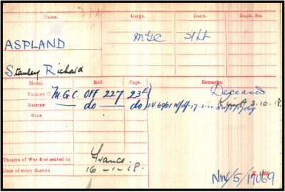 Enlisted originally as Private 3/21165, 3rd Battalion, East Surrey Regiment. In Ely, on 6th December 1916, he gave his address as Hills Lane, Ely, age as 25 years 8 months, occupation-clerk. Height 5 feet 8.25 inches (173.3 cm), chest 36" to 39" (91.4 to 99.1 cm), weight 136 lbs (61.7 kg), which had changed by the time of his commissioning to 5' 9.75" (177.1 cm), and 130 lbs (59 kg). He was posted to the Reserves on 7th December 1915 and mobilised on 19th May 1916 and posted to the 3rd East Surreys on 11th May 1916. From 5 Company, 3rd East Surreys at Grand Shaft Barracks, Dover, on 25th November 1917 at Bisley, he was admitted to the 7th Battalion, Machine Gun Corps Officer Cadets. 16th January 1918 he arrived in France and joined Base Depot before being posted to join 183 Coy., on 22nd January. On 30th June he was admitted to hospital, ending up on 2nd July in 30 General Hospital, rejoining Base depot on 9th July and his own unit (61st Btn) on the 16th July. The forms do not indicate whether this was due to illness or wounding. He was on leave in UK from 8th to 22nd August 1918m, returned to his unit on 23rd August and was killed in action on 3rd October. He was buried by the 200th Battalion, Machine Gun Corps, who relieved the 61st that night. His widow did receive his "Officers Record Book" which was on his person, but sought in vain for other personal belongings, which had much sentimental value. although of little intrinsic value. The above from his Army Officers records, National Archives. The Battalion war diary has :- La GORGUE..3/10/18.."A" and "B" companies advanced in close support of the infantry following up the enemy retirement. "C" and "D" companies were relieved in the Reserve area by two companies of the 200th M.G.Battalion and moved with Battalion Headquarters to the FONTES-MAZINGHEM area. During the night "A" and "B" companies were relieved by two companies of 200th M.G.C. in the line as per Operation Order ).49 and March Table attached.. Casualties Capt RICHARDS P. MC (killed) 2/Lt ASPLAND S.R. (killed) 1 O.R. killed, 6 O.R. wounded. Reinforcements:- 2/Lt DAVIES W.D.M., Lieut. GRAY G.S. 10 O.R.s The war was at a far more mobile stage and Stanley was found and buried near the centre of La GORGUE. As was explained to his family in 1920, in agreement with the French and Belgian governments, all the scattered individual burials, cemeteries with less than 40 graves or those in unsuitable places were subject to exhumation and re-interment in other CWGC cemeteries, hence Stanley now rests at Lavantie. |