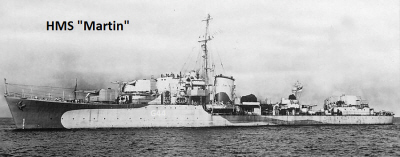 | HMS "Martin" was an M-class destroyer of the Royal Navy, launched on Tyneside at the yard of Vickers-Armstrongs on 12th December 1940. She was sunk by U-431 on 10th November 1942 off Algiers. Force 'H' was the covering force for the Allied landings in Algiers and Oran, on 8th November 1942. The task of Force 'H' was to guard against the Italian Fleet, during the landings. HMS "Martin" was torpedoed by German submarine U-431 [Dommes] on the morning of 10th November as a result of which she blew up and sank in position 37:53'N 003:57'E. The only survivors were four officers and 59 ratings picked up by HMS "Quentin", 161 died. |
