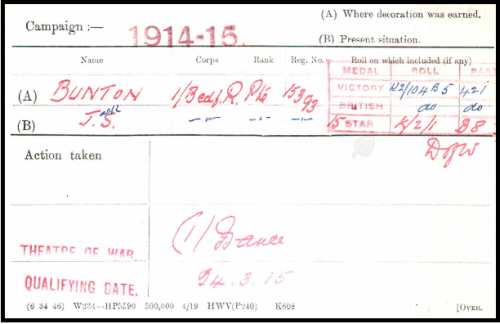 As he died of wounds and his Army service record has not survived, it is impossible to say for sure when or where he was wounded. However the Haverhill Echo in June 1915 reported that Jack Bunton died in Aldershot in the military hospital. He had been wounded in the back by shrapnel in the fighting for Hill 60. His parents visited him and his mother was by his bedside when he died. Confusingly one of the military hospitals in Aldershot was named the Cambridge Hospital, and that was the one where he died. The Army record then had his name as John Stanley Bunton. |