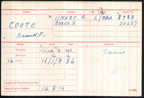 Frank Frederick Coote was born in Steeple Bumpstead (Risbridge Q4-1893 4A:670), son of Frederick and Fanny COOTE. ( née UNDERWOOD), who died in 1894 Q4, quite possibly at the time of Frank's birth. Despite his birth registration as Frank Frederick, it seems only the Army used his Christian name of Frank