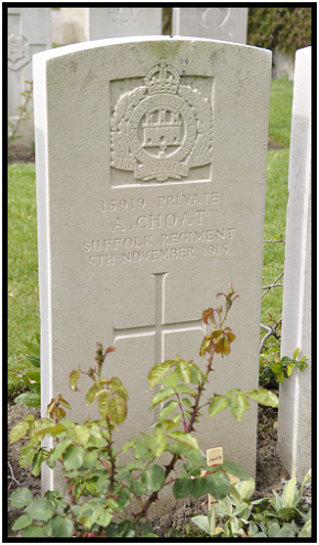 Arthur Choate was born in Sturmer [Risbridge Q2-1890 4a:640], son of Walter and Annie CHOATE (née SPARKES). 1891 census...Aged 1, he was at Kedington End, Sturmer with his father Walter CHOATE [36] farm labourer born Sturmer and his mother Annie [27] born Stoke. Annie's other children, Lily SPARKES, born Sturmer Q1-1887 4A:631 was with her brother John SPARKES [9] born Wixoe and staying with their grandparents John and Rebecca FORD at Kedington End, Water Road, Sturmer in 1891 1901 census...Aged 11, he was at Brickwall Road, Hundon with his parents; sister Ada [8] born Sturmer; brothers Joseph [6] and Walter [1], both born in Hundon. half brother John and half sister Lily were still with their grandparents ia Kedington End 1911 census...Aged 21, farm labourer, he was at Haverhill Road, Sturmer with his parents (father now a shepherd; half sisters Lily [24] born Sturmer; sisters Ada and Ella [9] born Hundon; brother Walter. 3 of the 7 siblings had died. Half brother John was still staying with his grandparents at Kedington End Brother Walter was S/7002, Middlesex Regiment when he was discharged on 15th June 1915 for "having made a mis-statement as to his age on enlistment". Apparently when he enlisted on 10th August 1914 he added at least 4 years to his age. His disciplinary record was not of the best and after nearly a year the Army discovered his real age. The family address a the time was Rowley Hill, Haverhill. Brother Joseph had joined the Royal Navy. |
