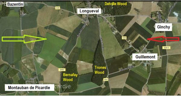 The 8th Suffolks were on the eastern edge of Bernafay Wood on 14th July 1916. War diary says:- Order received the 53rd Bde attack TRONES WOOD had not been successful and that 54th Brigade were being put in - Battalion marched to BILLON WOOD, arriving at 7 am. CO had conference with Brigadier - Battalion ordered to march via TALUS BOISE -BRIQUETERIEand to take over defence of Chimpanzee Trench (A.5.d.) to SE corner of BERNAFAY WOOD and then along eastern edges of wood as far as Railway:- The Battalion was in position by 11:30 am, the right of the battalion joining up with the FRENCH Battalion HQ at BRIQUETERIE. CWGC figures show 4 of the 8th Suffolks killed this day A letter, sent to his Mother by his Platoon commander, was printed in the South West Suffolk Echo on 5th August 1916. The letter was sent to Mrs Claydon at St Leonards Lodge, Wixoe, and reads as follows:- "Dear Madam, It is with great regret that I am compelled to write to you to inform you of your son's death. Pte. J. Claydon was in my platoon and was one of the most popular of my men. He was an excellent soldier and always performed his duties cheerfully and thoroughly. He was killed on the 14th July, 1916, at about 4 o'clock in the afternoon. He was buried the next day and a service read over the grave by our Chaplain, the Reverend Frazer. His grave is situated in the Bricquetine, about a quarter of a mile from the village of Montaubaro [Montauban]. It will, I am sure, be a great comfort to you to know that he died an instant death and could not possibly have felt any pain. I must apologize for not having written sooner, but we have been in the firing line ever since and writing has been impossible. Please accept sincerest sympathies of the men of the platoon and that of the Company Officers. Yours, J. Hannaford, Second-Lieut". James was obviously yet another whose grave was lost in later fighting. |