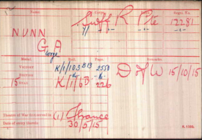 Born in Woodditton in 1894, George Albert (Newmarket Q2-1894 3B:506), son of John and Sarah NUNN (née CORNELL). 1901 census...None of the family can be found in the 1901 census. They are in Woodditton in 1891. 1911 census...Aged 16, a farm labourer, he was at 80 Little Ditton, Woodditton with his widowed mother. Of her 10 children, only one had died. |