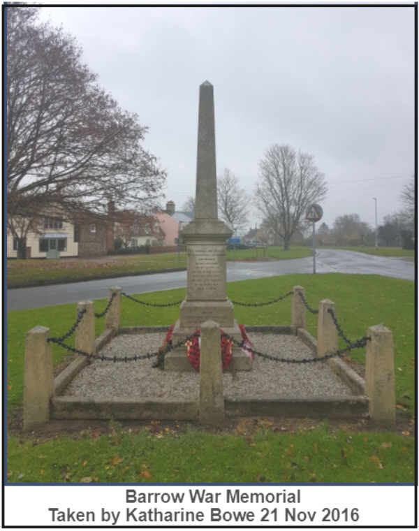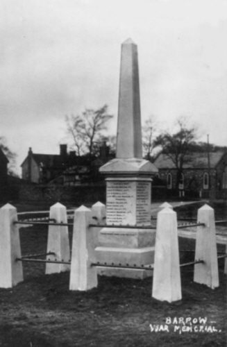 The war memorial is on the Village Green in Barrow, a portland stone obelisk about 3 metres tall, standing on 3 steps, surrounded by stone posts and chains.