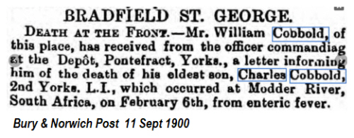 1881 census...Aged 9, he was at Free Wood Street, Bradfield St George with his father William COBBOLD [34] farm labourer born Bradfield St George, his mother Sarah [37] born Rougham; brother William [5] and sister Elizabeth [7] both born Bradfield St George