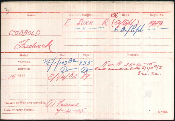 The photo here is recorded as of Freddy Cobbold, but I have an uneasy feeling I have have seen it elsewhere as another man Freddy Cobbold was born in Bradfield St George (1st qtr 1881 Thingoe 4a:587) son of William and Sarah Elizabeth COBBOLD (née GILL). Baptised on 17th January 1881 in Bradfield St George 1881 census...Aged 3 months he was at Free Wood Street, Bradfield St George with his father William COBBOLD [34] farm ;labourer; his mother Sarah [37] born Rougham; brothers Charlie [9] born Hessett, William [5] and Alfred [3] both born Bradfield St George; sister Elizabeth [7] born Bradfield St George and half sister Emma GILL [14] born Rougham before Sarah married William. 1891 census...Aged 10, he was still at Free Wood Street with his parents; brothers William, Alfred and Arthur [2]; sisters Annie [7] and Lillie [5] 1897... He enlisted in Rifle Brigade. 1901 census...Aged 20 he was in the Army in South Africa On 9th September 1905 in Rougham, he married Rosina COCKSEDGE [11-7-1884] 1911 census...Aged 30, a farm labourer, he was at Kingshall Lane, Rougham with his wife Rosina [26] born Rougham and thier daughter Lily Violet [5] born Bradfield st George His widow later married George J BALDRY of Oak Lane, Rougham. His eldest brother Charles died from fever in the the Boer War in 1900 see here brother Arthur died in Greece in 1916. see here and brother William was killed, also in Belgium, in May 1915. see here |
