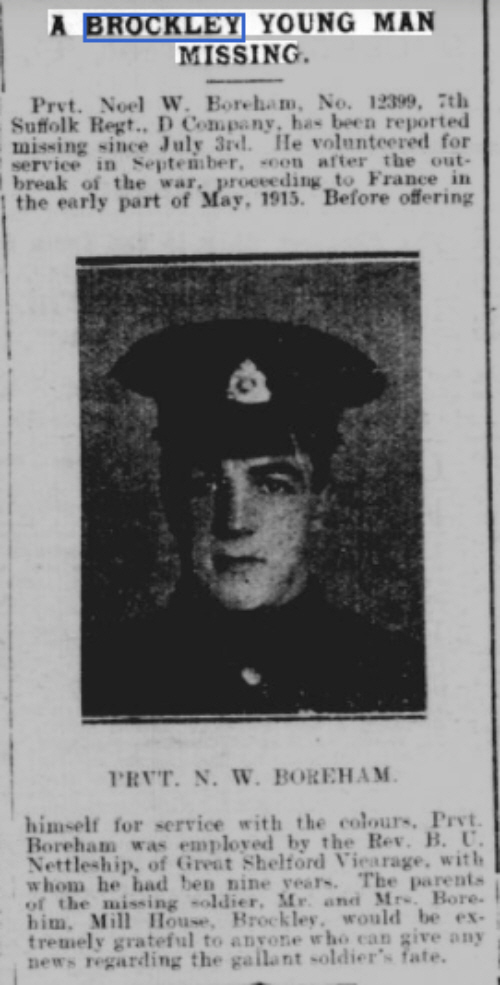 Noel Walter Boreham was born in 1892 in Brockley (1st qtr 1892 Thingoe 4a:758) son of Walter and Alice BOREHAM (née SHARPE)