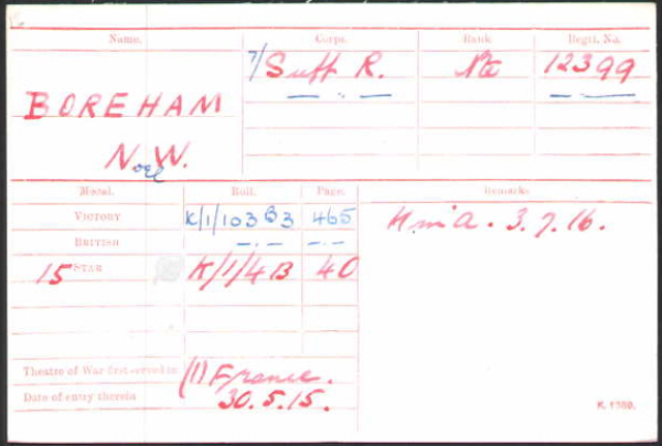 1901 census...Aged 9, he was at Church Lane, Brockley with his father Walter BOREHAM [35] wood sawyer; his mother Alice [35] born Great Saxham; brother Stephen [6]; sisters Phyllis [4] and Dorothy [2]. All except his mother were born in Brockley.