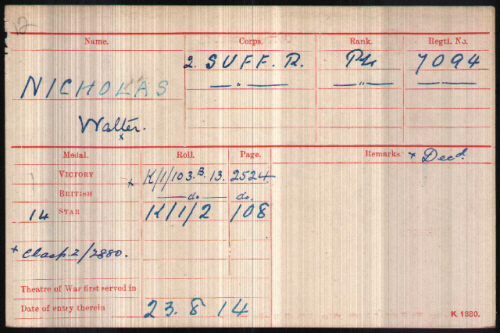 1891 census..Aged [7] Walter Nichols was at 7 Little London, Eriswell with his father James NICHOLS [39] farm bailiff born Mildenhall; his mother Elizabeth [39] born Mildenhall; sisters Kate [14] born Mildenhall, Sarah Ann [11] born Eriswell; brothers James [5] and Robert [2] both born Eriswell. 1901 census...Aged 17, Walter NICHOLLS, farm labourer born Eriswell was at Workhouse Lane, Barton Mills with his father James NICHOLLS [[50] farm foreman born West Row; mother Betsey NICHOLLS [50] born West Row; brothers James [1 57] farm labourer born Eriswell and Robert [12] born Eriswell. Lewis NICHOLLS [2] born Barton Mills is recorded as grandson of Betsey but his parentage is not currently known. 1911 census...Aged 25 he was in the Suffolk Regiment, in Egypt. In Barton Mills were his widowed mother Elizabeth NICHOLAS [59] born West Row; his sister Kate [34] born West Row, brothers James and Robert (farm labourers, born Eriswell). Lewis [12] born Barton Mills and Mary Irene [6] born Barton Mills were both recorded as Elizabeth's grandchildren His younger brother James was killed in the same action, presumed killed on 22nd March 1918. see here |