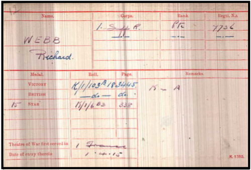 Given the propensity for changes in spelling of names, this does appear to be the man. His mother may well have given his name for the Burrough Green memorial (but spelled WALLACE) and his grandmother or uncle put him forward under his legal surname for the Great Bradley memorial. 1891 census...Aged 1,he was at Newmarket Road, Great Bradley with his grandfather Richard WEBB [53] musician born Great Bradley; his grandmother Harriet [43] born Cowlinge; great uncle George WEBB 38] musician born Great Bradley and cousin Luke WEBB [21] farm labourer born Little Thurlow. 1901 census...Aged 11, he was "Below the Hill", Great Bradley with his great uncle George, now a farm engine driver, and his widowed grandmother Harriet. 1911 census...He was at Polymedia Camp, Cyprus with the Suffolk Regiment, his service number is compatible with joining in 1908. It seems he is the Richard J Webb who married Alice A SPARKES in 1915 (Newmarket Q1-1915 3B:812) since his sole legatee is recorded as widow Alice Ann. The pension card records his widow with an adopted son Bertram SPARKES [10-8-1914]. The card also has Richard's date of death as April, not May. |