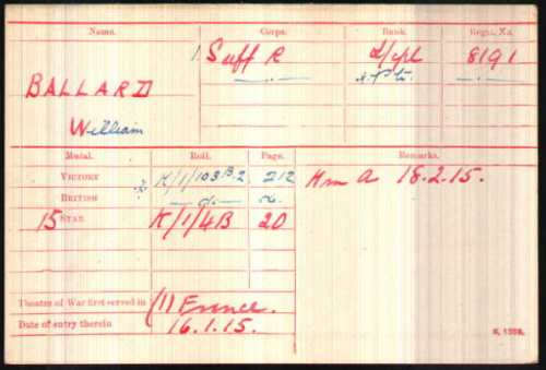 William Ballard was born in Cavendish (Sudbury Q4-1891 4A:709), son of Charles and Eliza BALLARD (née BROWN) 1901 census...Aged 9, he was at High Street, Cavendish with widowed mother Eliza; brothers Harry (farm labourer) and John; sister Edie [5] born Cavendish. 1911 census...Aged 19, He was at Gibraltar Barracks, Bury St Edmunds a private in the Suffolk Regiment. "near the church" Cavendish were his mother; sister Ada, brother John (general labourer), brother Harry ; niece Olive Tonkin [5] born Erith, Kent (parentage unknown). The pension card has his mother Eliza at Church Corner, Cavendish. His brother John was killed serving in Belgium in the Suffolk Regiment later in 1915 see here |