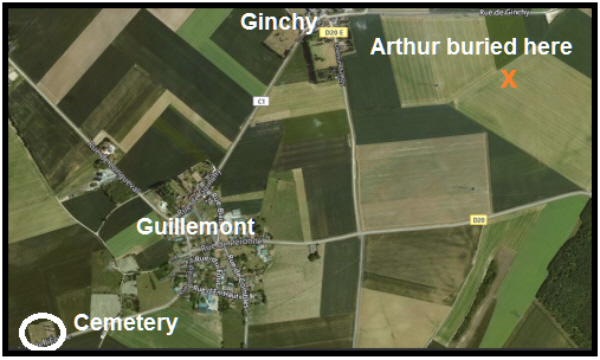 Cavendish, enlisted in the Suffolk Regiment the same day He enlisted in Sudbury. Lt Col Murphy's "History of the Suffolk Regiment tells us :- On the 13th September 1916 the 9th Suffolks attacked the Quadrilateral, near Ginchy. Attacking with three companies in the front line and one in support, zero hour was 6.20 am. They got through the German outpost line quite easily but in the open ground beyond, for 400 yards from the German wire, they came under very heavy machine gun fire from the Quarilateral strong point. No further progress could be made, although Lt Macdonald got close enough to throw a bomb into the stronghold, being injured as a result. Another attempt was made at 7:30 am, with "A" Coy included, but to no avail. A third attempt was made in the evening which also failed, so they dug in on a line about half a mile from the morning's jumping off point. 47 men were killed, 28 have no known grave. Arthur is recorded as dying on or since 13th September and "Soldiers Died" say he died of wounds, so that date was the last time he was identified but must have been seen to have been wounded. He was initially found and buried (identified by a cross)as per the image below, but was removed to Guillemont Road after the war.