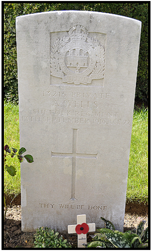 Arthur Wells was born in Cavendish (Sudbury Q1-1892 4A:738), son of Charles and Elizabeth WELLS (née SLATER). 1901 census...Aged 9, he was at High Street, Cavendish with his father Charles WELLS [34] farm labourer; his mother Lizzie [30] born Glemsford; brothers Charles [10] born Glemsford, Richard [6] and George [1]; sisters Florence [7] and Edith [3]. All except his mother and brother George were born in Cavendish. 1911 census... Aged 19, farm labourer, he was "near the Church", Cavendish with his parents; brothers Charles (farm labourer), Richard (butcher's boy), George, John [9], Frederick [4] and Edward [1]; sisters Florecne and Sarah [7]. Thenew siblings born in Cavendish, all nine children survive. |