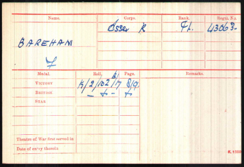 1891 census...Aged 1, he was in Bridewell Street, Clare with his father John BAREHAM [30] farm labourer; his mother Emma [28]; sisters Rose [8] and Ada [5]; brother Charles [3]. All were born in Clare. 1901 census...Aged 11, he was still in Bridewell Street, Clare with his parents (father now a stock man); sisters Ada and Jane [8]; brothers Charles (yardboy on farm) and Bertie [3]. The new siblings also born in Clare. 1911 census...Aged 21, he appears to be at 31 Bentinck Street, Mansfield with his aunt Julia DEEKS (née BAREHAM) assisting his cousin William DEEKS as a baker. His parents, sister Jane and brothers Charles (bricklayer's labourer) and Bertie (farm labourer) were still in Clare at Bridewell Street and they were still there on the pension card |