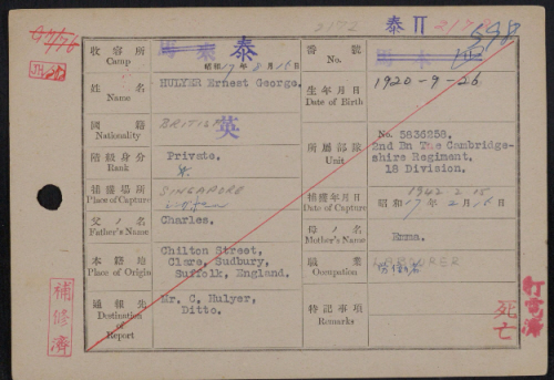The 1939 register has his parents and 2 brothers at Motts House, Chilton Street, Clare RD. His father Charles [3/12/1878] was a labourer; mother [16/12/1881]; brothers Willie A [5/5/1909] a ploughman,and Arthur [25/6/1915] also a ploughman. His Japanese prisoner of war card actually gives a date of birth as 1926 (year and day apparently transposed). It gives his parents address as Chilton Street, Clare and his occupation as labourer. |