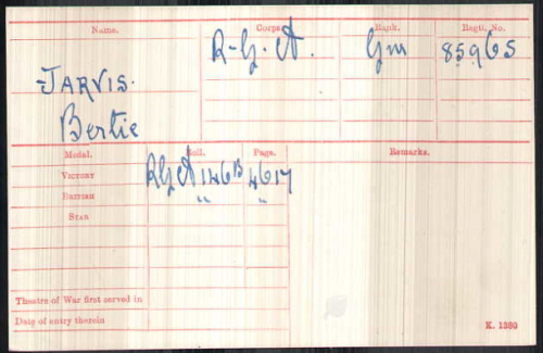 Bertie Jarvis was born in Clare on 21st January 1895 (Risbridge Q1-1895 4A:542) son of Walter and Mary Ann JARVIS (née TAYLOR).