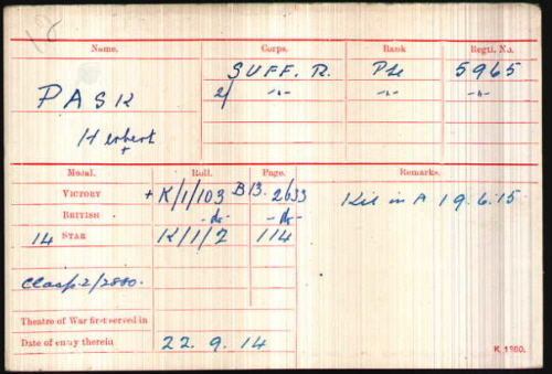 1891 census...Aged 8, he was at Lodge Farm, Chilton Street, Clare with his father Walter PASK [42] farm labourer; his mother Hannah [48] born Ashen; sisters Elizabeth [21] and Kate [13]; brother Willie [11]. All except his mother were born in Stoke by Clare. 1901 census...Aged 18, a hay binder, he was boarding at Pear Tree Cottage, Black Notley, Essex with Alfred and Sarah GALLEY. His parents and brother Willie were still at Lodge Farm, Chilton Street, Clare. 1911 census...Aged 28, a horse man, he was back in Chilton Lodge Farm, Chilton Street, Clare with his parents. The pension card puts his mother at Lower Green, Stoke by Clare (she died 13-3-1924) |