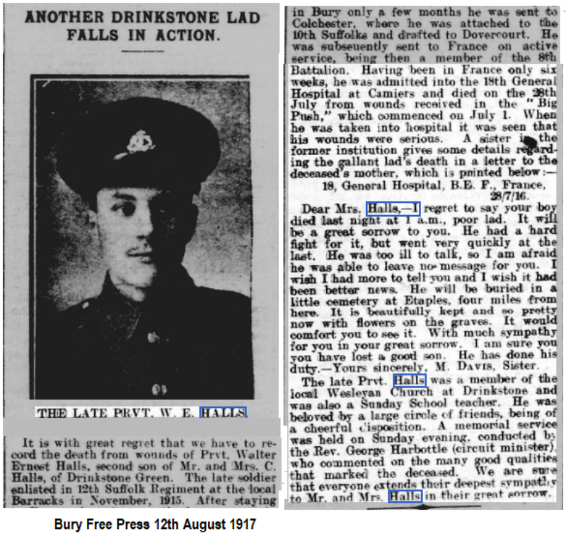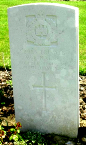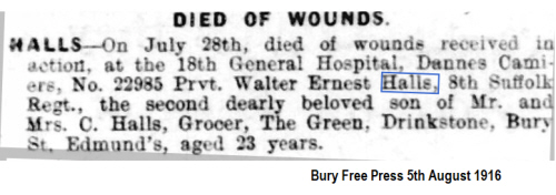 Walter Ernest Halls was born in Drinkstone (1st qtr 1893 Stow 4a:817), son of Charles Louis and Emily HALLS (née HOLLAND)