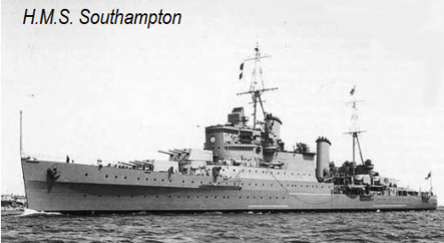 George enlisted in 1937. He was serving on HMS Southampton, a light cruiser, when, laying at anchor off Rosyth on 16th October 1939, she was hit by German bombers. Fortunately only minor damage was caused and she was quickly repaired and back on duty. One such duty was involvement in the Norwegian campaign at Narvik in 1940. Then in November 1941 she moved to the Mediterranean, escorting convoys to Malta. Following a convoy escort to Durban, South Africa, she returned to the Mediterranean and on the 11th January 194 she was escorting convoy 'Excess' and was SE of Malta when hit by two delayed action bombs. The damage was too extensive for repair, especially while under air attack. The survivors were taken off and she was abandoned and sunk by torpedoes from HMS Gloucester and HMS Orion.