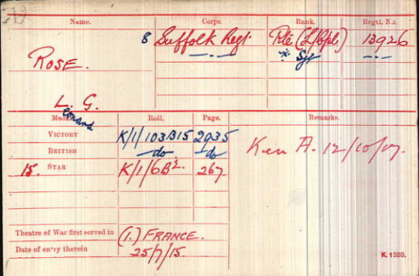 1891 census...Aged 8, he was at Rattlesden Road, Drinkstone with his father William ROSE [42] farm labourer born Woolpit; his mother Keziah [43] born Sicklesmere; sisters Abigail [16], Beatrice [10], Eva [9] and Rebecca [1]; brother Walter J. [14] farm labourer, Cecil R. [6] and Sydney A.[4]. All the children were born in Drinkstone. 1901 census...Aged 18 (now George) a farm labourer, he was at The Green, Drinkstone with his parents; brothers Walter (farm labourer), Cecil (yardman on farm) and Sidney (farm Labourer); sisters Beatrice, Eva and Rebecca. He married Anne Jane ARMSTRONG [28-2-1877] in January 1911. 1911 census...Aged 28, horseman on farm, he was at The Green, Woolpit, with his wife Annie [32] born Castle Bellingham, Co. Louth, Ireland. His parents, sisters Abigail and Rebecca and brothers Cecil and Sidney were at Drinkstone Green. Leonard and Anne had two sons, David George Armstrong [28-8-1911] born Drinkstone and William Eric Rose [2-10-1913] born Woolpit. On the pension card his widow was at Woolpit Green. In 1920 she married Frederick BOBY and lived at Ravensworth, Brooklands Avenue, Cambridge. His brother Cecil was killed was killed in 1917 see here and his brother Sydney was killed in 1916 see here |