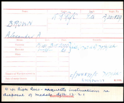 It is more than likely he was A/201829, Rifleman Alexander Andrew BROWN of the 16th Battalion, King's Royal Rifle Corps, born in the