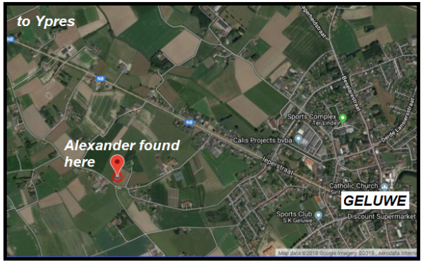 Alexander was found here and re-interred in Hooge Crate Cemetery on 25th July 1919 photo: Rodney Gibson click here to go to the Commonwealth War Graves Commission website for full cemetery/memorial details |