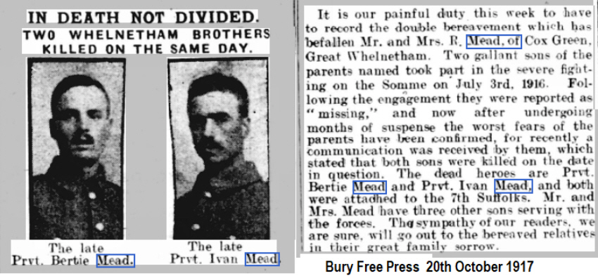 1901 census...Aged 8, he was at 2 Cock's Green Cottages, Great Welnetham with his father Robert MEAD [39] farm labourer born Stanningfield; his mother Emily [36] born Hawstead; brothers Willie [9], Bertie and his twin brother Archibald [6] and Thomas [5]; sister Elsie [2]. All the children were born in Great Welnetham. 1911 census...Aged 18, a farm labourer, he was at Cock's Green still with his parents, sister Elsie; brothers Bertie, Algie Robert, Archie and Thomas (all farm labourers),Hubert Claud [9] and John Albert [7]. His mother had lost 2 of her 11 children. On the pension card his mother was at Great Welnetham. His brother Bertie was killed the same day, in the same operation see here |