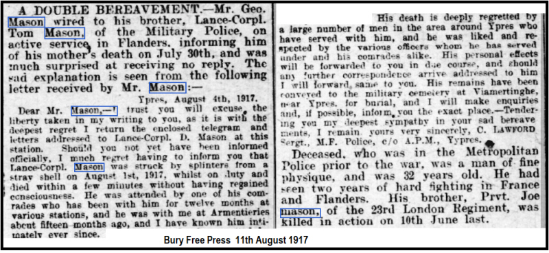 1891 census...Aged 5, he was in Hawkedon with his father Daniel MASON [52] farm labourer; his mother Sarah [50]; brothers William [15] farm labourer, Charles [10] and Joe [7]; sister Sarah A [13]. All were born in Hawkedon 1901 census...Aged 15, he was at The Green, Hawkedon with his parents and brother Joe. All the men were farm labourers. 1911 census...Aged 25, a Metropolitan Police constable, he was boarding at 8 Manor Place, Amhurst Road, Hackney. His widowed mother was still at The Green, Hawkedon, his father had died in 1901. His mother died on 30th July 1917 No pension card has been found as both his parents had died. His brother Joe was killed on 7th June 1917, in France, serving in the London Regiment. see here |