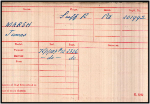 1901 census...Aged 4, he was at Waterfield Road, Great Bradley with his father James MARSH [35] shepherd; his mother Kate [26] born Great Thurlow and sister Elizabeth [1]. All except his mother were born in Great Bradley. He was admitted/re-admitted to Great Bradley Voluntary School on 1st December 1908 and left on reaching 13 years of age. 1911 census...Aged 13, a back house boy, he was at Great Bradley with his parents and sister Elizabeth. No documentation has been found linking him with Hawstead |
