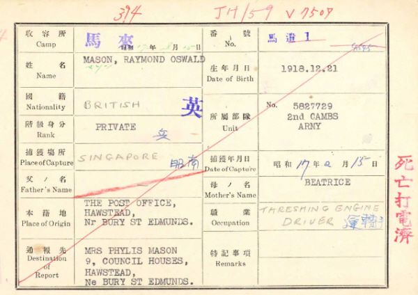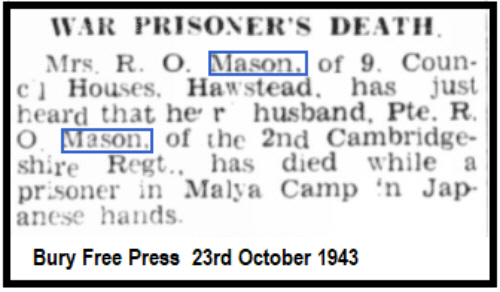 Raymond Oswald Mason was born on 21st December 1918 (at the Post Office, Hawstead) (1st qtr 1919 Bury St.Edmunds 4a:1165) son of Beatrice Maud MASON. Joe and Ellen are his parents on CWGC, but the Japanese PoW card has his mother as Beatrice.