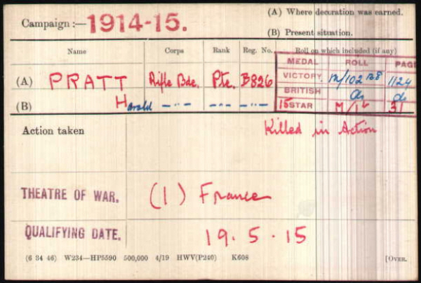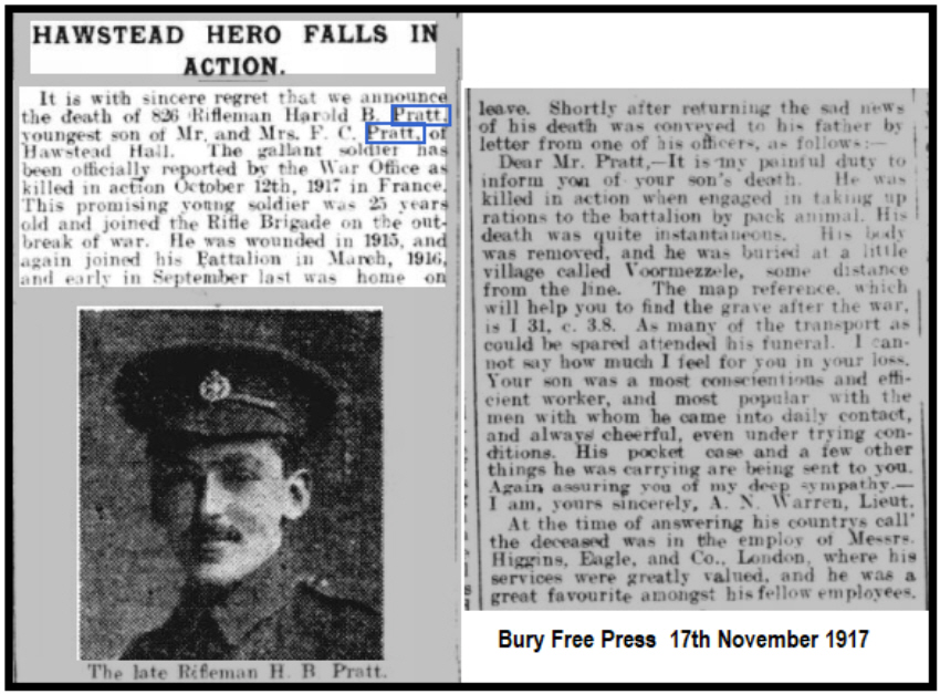 Harold George Pratt was born in Hawstead (3rd qtr 1892 Risbridge 4a:691) son of Frederick Charles and Jane PRATT (née CROSS)