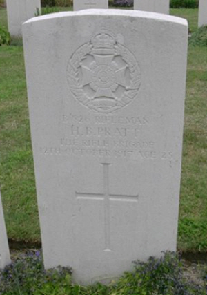 brown hair, Church of England. He joined the Rifle Brigade at Winchester on 25th August, posted to 7th Battalion. Posted to BEF Depot 19th May 1915, and the 5th Battalion on 5th October 1915, finally the 7th Battalion on 8th March 1916. Wounded in left leg on 20 July 1915, he was back in UK from 30th July 1915 to 8th March 1916 Army Form5080 has living relatives at time of his death: Parents, brothers Frederick Charles[34], Cyril Guy [31], sisters Ethelrine Daisy[40] and Muriel Rosalie [25] living at Hawstead Hall; brother Herbert Harry [44] at 9 Cornhill, Bury St.Edmunds, Cecil Roy [39] at 48 Osborne Road, Palmers Green, sister Kate Olive May MARSH[47] at Fyletts Manor Hawstead, with sister Florence Evelyn [29], sister Winifred Violet ? [37] at 37 Kelvin Road, Highbury. He was killed carrying rations up the the trenches in the line between the Menin Road and the Reutelbeck.