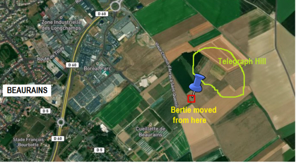 The war diary has :- 9-4-17....Attacked TELEGRAPH REDOUBT at 7:30 am. A certain amount of bunching was caused by Battalion on our right losing direction and K.S.L.I. who had to go through us - failing to wait for the lift of the barrage.thus finally mixing up with the battalion's leading wave. Three M.G. were knocked out by L.G. fire and rifle grenades. About 150 German prisoners taken. The objective was reached and consolidated Casualties were as follows - officers killed 5, wounded 8, ORs killed 45, wounded 116, missing 41.......by 11 am the HARP was practically safe and men returned to dug-outs rested The Telegraph Redoubt was close to where Bertie was first buried (see image below). The objective gained was practically the whole of Telelgraph Hill which also included HARP REDOUBT