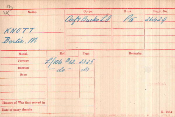 Bertie Montague Knott was born in Ixworth (3rd qtr 1882 Thingoe 4a:616) son of Herbert Oliver and Emma KNOTT (née HOLMES ).