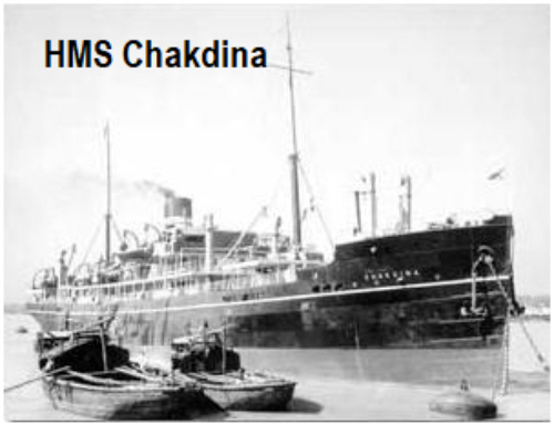 years, (7 plus 5 on Reserve) he was 6 feet 2.75 inches tall, chest 37.25, brown eyes, dark brown hair. On completion of his 7 years (1933) he then joined the Police, being posted to Ixworth. He was mobilised on 4th December 1939 and quickly posted to HMS Chakdina on 2nd January 1940, and presumed dead on 5th December 1941 due to "enemy action". Chakdina was built in Scotland as a passenger/cargo ship for the British India Steam Navigation Company. In 1940 she was taken over by the Royal Navy as H.M.S. Chakdina and fitted with two 3 ponder guns (later with two 4 inch and one 12 pounder) as an Armed Boarding Vessel. On 5th December 1941, sailed from Tobruk for Egypt with around 600 men including 380 wounded soldiers with officers and medical staff. At 9pm an Italian aircraft dropped a torpedo and hit the ship's after hold. She sank in three minutes. Some not seriously wounded reached the escorting destroyer HMS Farndake. Some 400 men perished. .