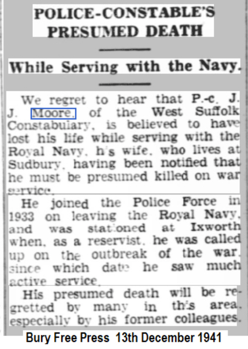 MOORE (née BISHOP). 1911 census...Aged 2, he was at 18 Homefield Road, Wimbledon with his mother B.Florence MOORE [39] as visitors to the house of builder Thomas HOLLOWAY. His mother had been married 16 years and had 5 children. His father was back at Silletts Lane, Darsham with Joseph's brother Andrew and sister Honor and grandmother Ellen MOORE. The family moved to Sudbury where he attended North Street School. Joseph had a brother and 3 sisters and the family lived at 1 Gardenside, Croft Road, Sudbury. His father was a platelayer on the Great Eastern Railway. He married Dorothy Eileen Friedar BIRD [25-7-1909] of Church Road, Great Cornard in 1st September 1934 at St Andrew's Church, Great Cornard. They had two children, David J [6-9-1938] and Hilda [1936]. Joseph served in the Royal Navy for 7 years, and then, in 1933, he joined the police force. After marriage he lived in the police house at Ixworth. In the 1939 register he and his wife and 2 children were at the Police House, Ixworth. As a reservist he was recalled to the Navy when war broke out. This meant that Dorothy and the children had to leave the police house so they went back to Cornard to live with Dorothy's parents.returned to Great Cornard to live with her parents in Church Road. His brother Robert died as a Japanese P o W in 1934 and is commemorated in Sudbury. |