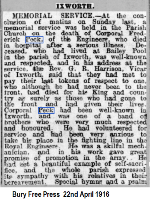 as part of Ixworth albeit the Ecclesiastical Parish For some reason his brother John is on the Pakenham and Ixworth memorials, but Frederick is only on Ixworth 1901 census...Aged 7, he was at Grimstone End, Pakenham with his father George PECK [52] farm labourer, his mother Elizabeth [49] born Ixworth; brothers Frank [19], Charles [17] and Sidney [14] all farm labourers, Alfred [11] and John [9]. All except his mother born in Pakenham. His mother died in 1908 1911 census...Aged 17, estate carpenter, he was at 57 Great Livermere boarding with his uncle and aunt,Harry and Mary Ann ROSIER and his grandmother Susan HOWE [92]. His widower father and brothers Sidney, Alfred and John, all farm workers, were at Baileys Pool, Ixworth. Another boundary confusion. His brother John was killed a year later in France see here |