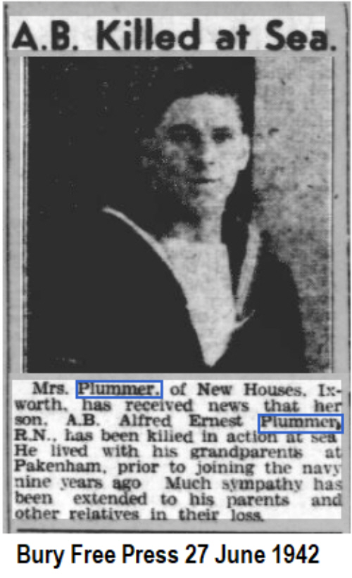 Alfred Ernest Plummer was born in Pakenham on 29th July 1917(3rd qtr 1917 Bury St.Edmunds 4a:1328) son of Monday and Bertha (née CRICK).