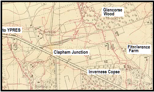 From "The Royal Fusiliers in the Great War", by H C O'Neill OBE we learn that: " On August 10th the 11th Battalion took part in one of those minor operations which are the aftermath of all great battles ; and it was their fate to fight over much the same ground as that on which the 4th Battalion had clashed with the Grenadier Guard Regiment in the first Battle of Ypres. The Fusiliers, the right assaulting battalion of the 54th Brigade, had their right flank near the Ypres-Menin road ; and at 4.35 a.m. B Company on the left, D on the right, attacked from this position. They advanced steadily against little opposition until the machine-gun fire from Inverness Copse — in the neighbouring brigade area — brought up the right flank and made it swerve to the left. On the left, however, the men penetrated some distance into Glencorse Wood, despite the ten or twelve " pill-boxes " standing like sentinels on the edge, some 200 yards from the south-west corner of the wood. Some of D Company also got well forward and reached Fitzclarence Farm. ....As a natural consequence, a gap was made between the 11th Battalion and the brigade on their right. In less than two hours all the officers of the assaulting companies were casualties, and a counter-attack was initiated by the Germans. The Fusiliers were out of touch with the troops on both flanks ; and a skilful bombing attack down the Jargon and Jap Trenches rendered their position impossible to maintain. Issuing from Inverness Copse the Germans almost penetrated to the rear of (C) the support company. Despite the cool and courageous handling of the men by the N.C.O.'s the Fusiliers could only remain where they were at the imminent peril of envelopment. They were compelled to retire and establish themselves some 200 yards east of Clapham Junction, in touch with the 55th Brigade on the right. Some of the men were cut off, and one of them gave a good account of himself. Private Arthur Jakes remained calmly in an advanced shell-hole, sniping all the day, and at night found his way through the German lines back to his battalion. The 11th remained in their position until 4 a.m. on August 11th when they were relieved. They went back to Dickebusch huts weaker by 17 officers and 328 other ranks than when they entered battle."