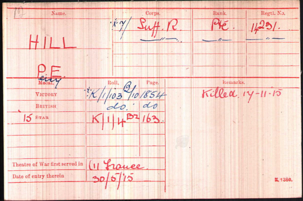 Percy Edward Hill was born in Lawshall (3rd qtr 1888 Sudbury 4a:646) son of John and Susan HILL (née FARROW). Susan was his father's