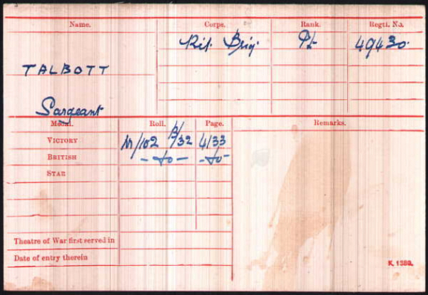 Sargeant Talbott was born in Lawshall (1st qtr 1900 Sudbury 4a:896) son of Edward and Julia TALBOTT (née BELVERSTONE)