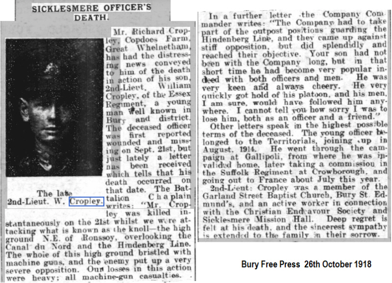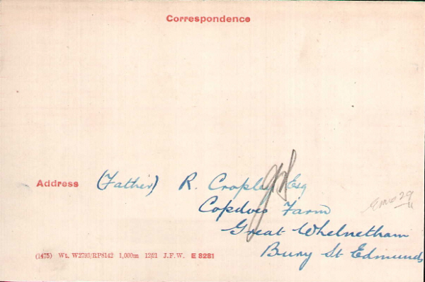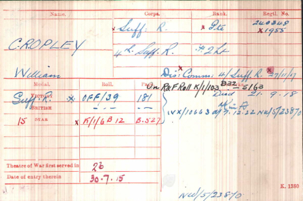 William Cropley was born in Little Welnetham (4th qtr 1897 Thingoe 4a:801), son of Richard and Priscilla CROPLEY(née SMITH). His mother died at or about the time of his birth. 1901 census...Aged 3, he was at Park Farm, Little Welnetham with his widower father Richard CROPLEY [57] farmer, born Swaton, Lincolnshire; his sisters Millicent A [21] born Finchingfield, Winifred F [9], Dorothy E [7]and Alice [6] these three all born in Little Welnetham; brothers Thomas [16], Percy R [14] and Harry [12] all three born in Finchingfield. 1911 census...Aged 13, he was at Park Farm, Rushbrooke with his father; sisters Millicent Annie, Dorothy Evelyn and Alice; brothers Thomas Edward and Percy Richard. It may well be that this is the same address, as the Welnethams, Rushbrooke and Sicklesmere boundaries were confused by the extent of the Rushbrooke Estate and of course "Hall Farm" is by no means unique. |
