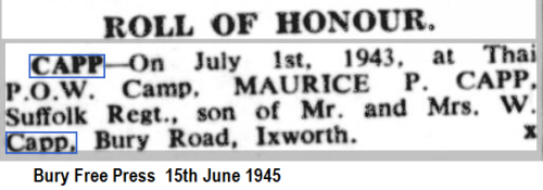 Maurice Pierson Capp was born in Long Stratton on 22nd February 1915 (1st qtr 1915 Depwade 4b:388), son of Wesley and Agnes Mary Ann (née
