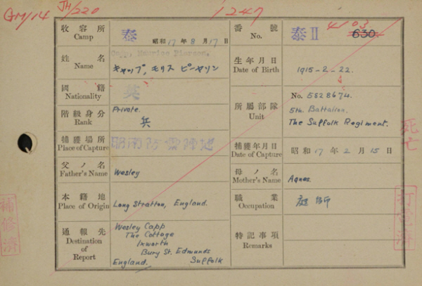 He was captured at the surrender of Singapore to the Japanese on 15th Febraury 1942. The cause of death was recorded as "Indigestion", another record says beriberi..